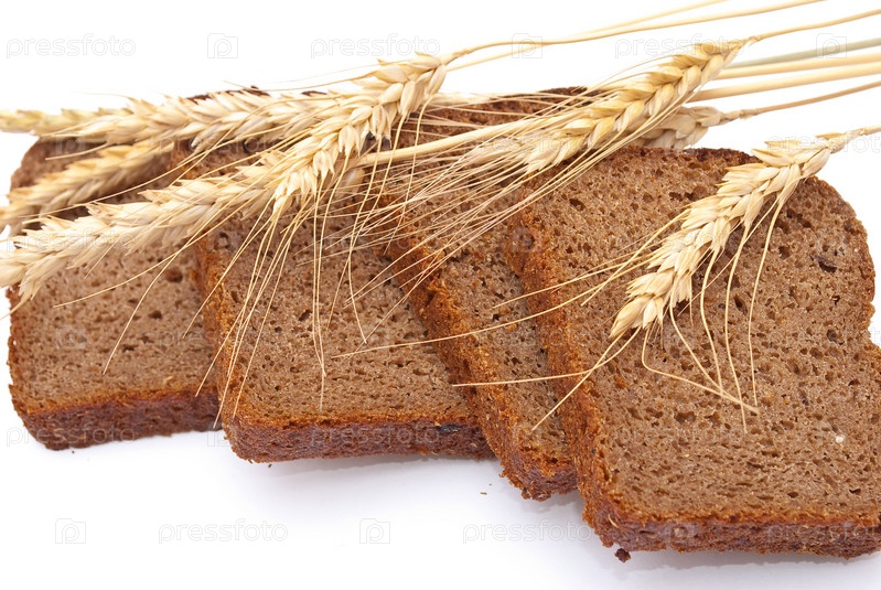 Ломтики свежего хлеба и колосья пшеницы на белом фоне