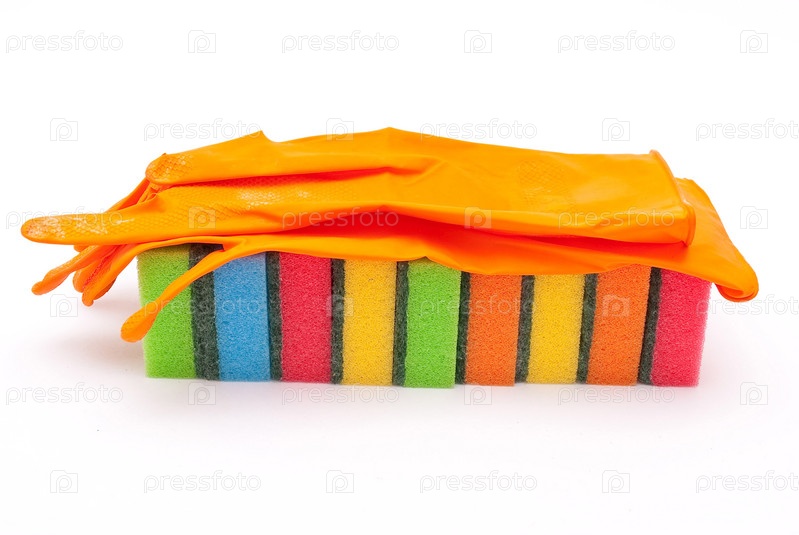 Резиновые перчатки и разноцветные губки для мытья посуды на белом фоне