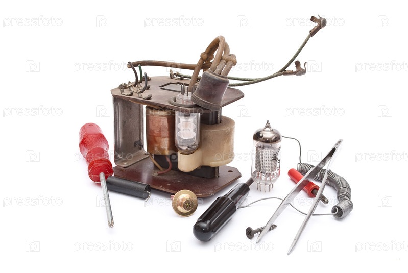 Электровакуумный прибор и инструменты на белом фоне
