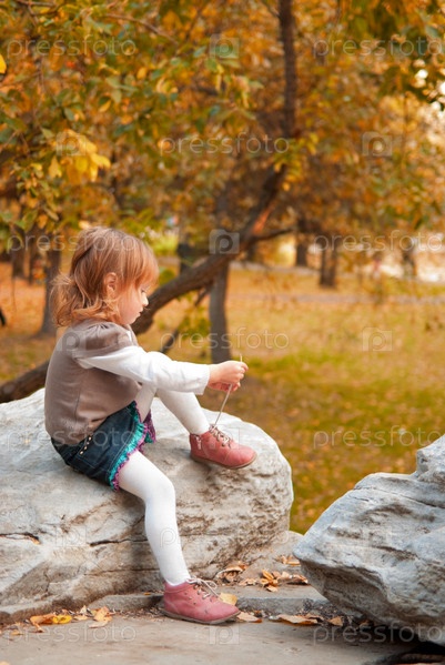 Маленькая девочка завязывает шнурки на ботинках