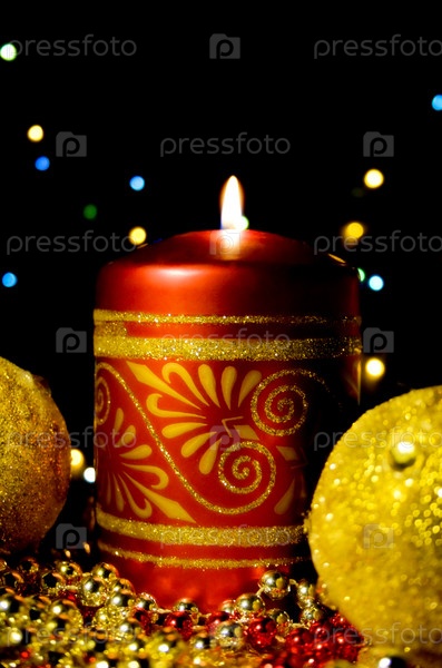 Рождественская открытка с горящими свечами и украшениями на елке