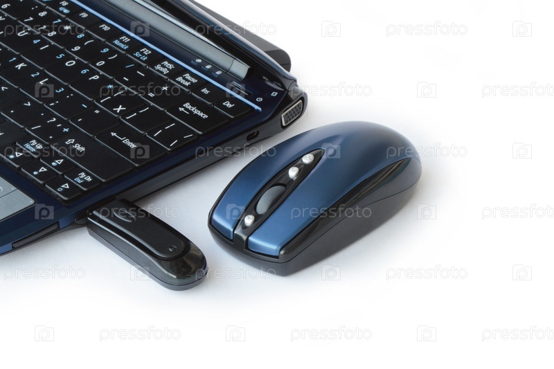 Современная беспроводная компьютерная мышь лежит рядом с ноутбуком