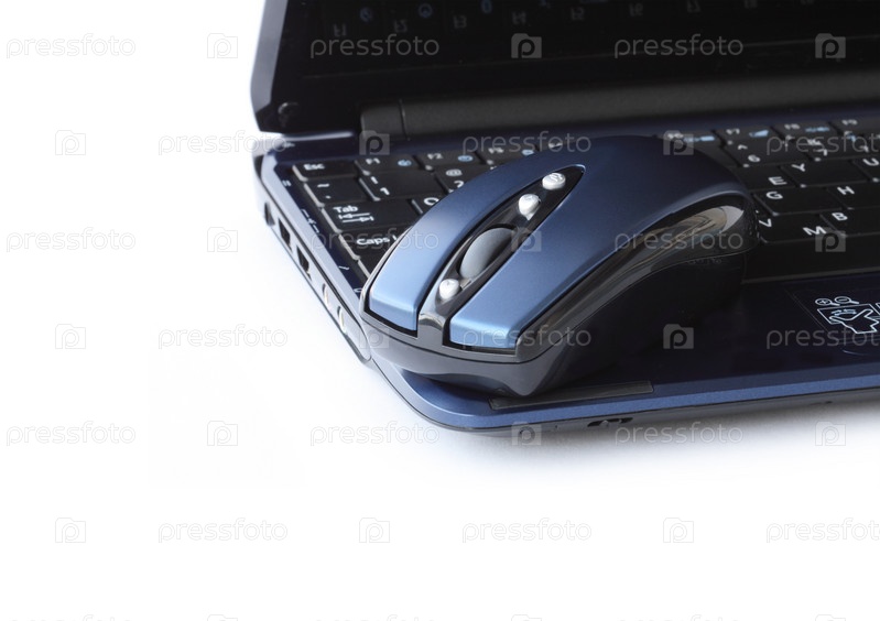 Современная беспроводная компьютерная мышь лежит на ноутбуке