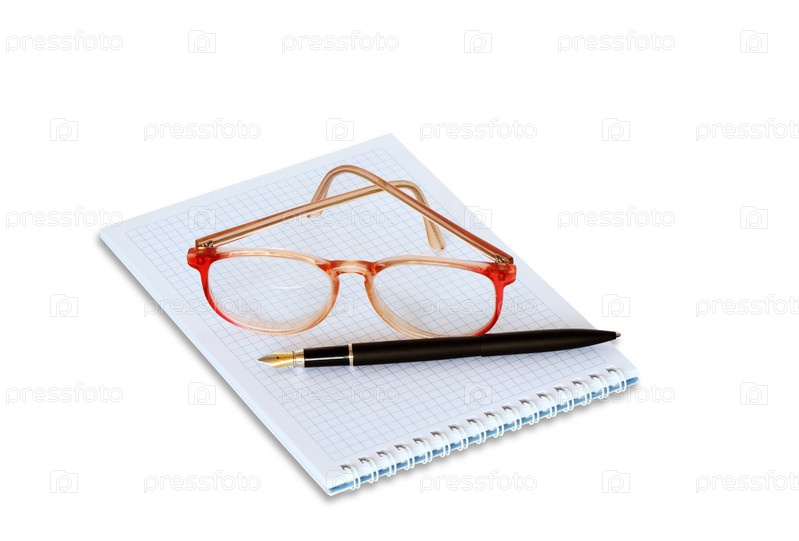 Очки и ручка лежат на блокноте на белом фоне