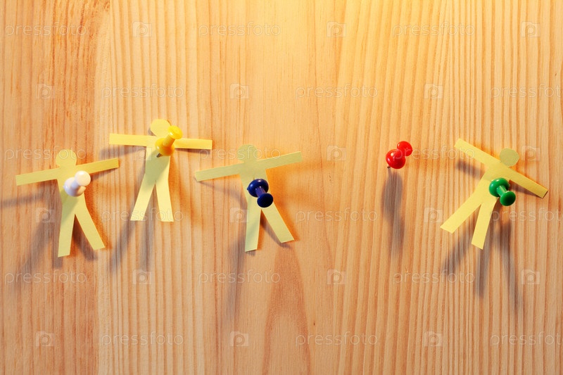 Четыре фигуры человека из бумаги прикреплены кнопками к деревянной стене