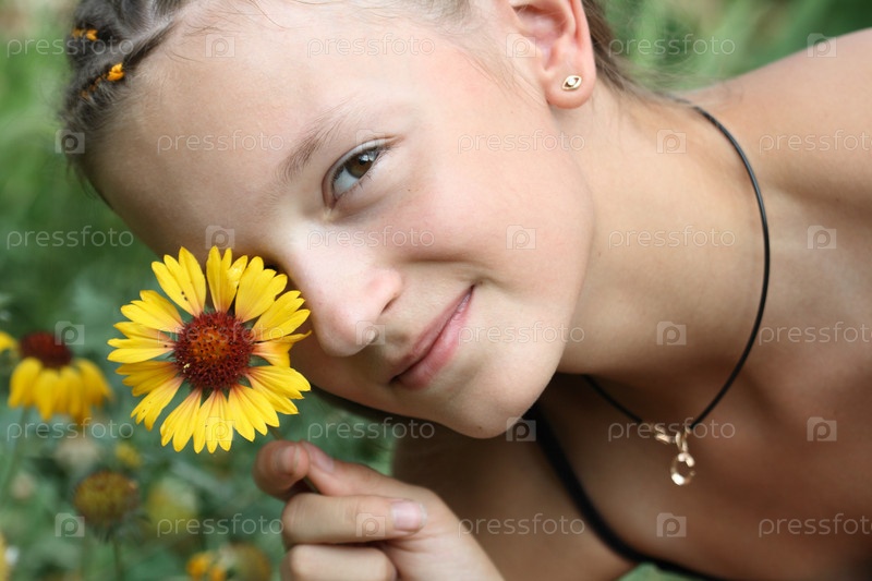 Портрет симпатичной молодой девушки с желтым цветком