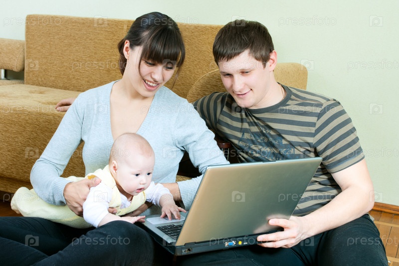 Счастливая семьи смотрит на экран ноутбука