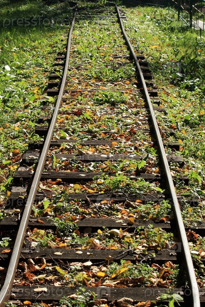 Рельсы, засыпанные осенними желтыми листьями