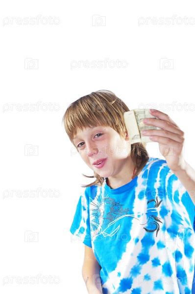 Маленький мальчик показывает деньги на белом фоне