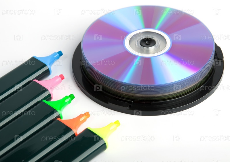 Цветные маркеры и стопка компакт-дисков на белом фоне