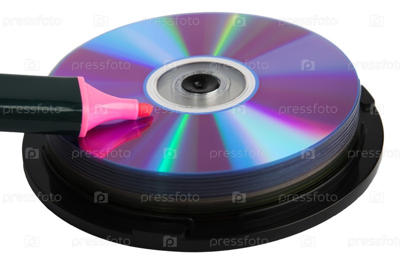 Розовый маркер и куча компакт-дисков на белом фоне
