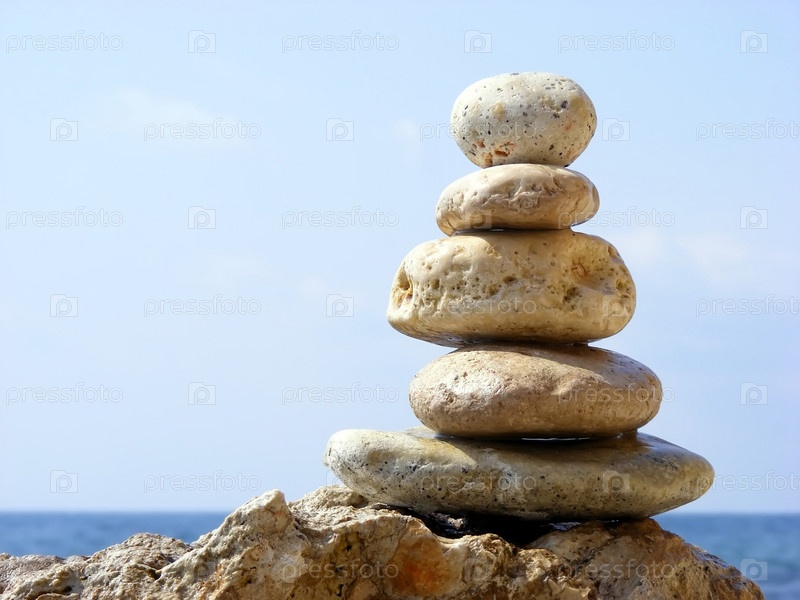 Пирамида из камней на фоне моря и неба с линией горизонта в солнце ясный безоблачный день