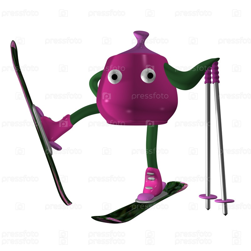 Чайник-сканер позирует на горных лыжах, 3d, изолированный, белый фон