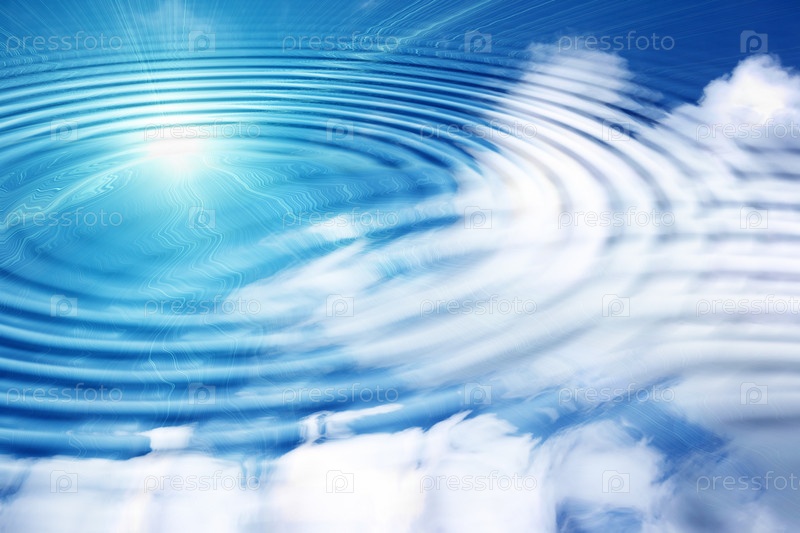 Отражение белых облаков и солнца на голубом небе в воде