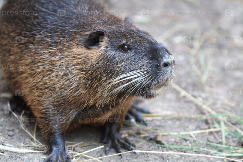 Нутрия крупным планом на фоне серой земли