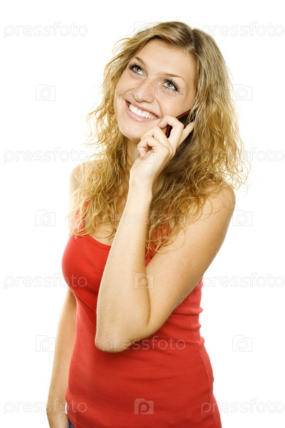 Симпатичная блондинка в красной майке разговаривает по телефону