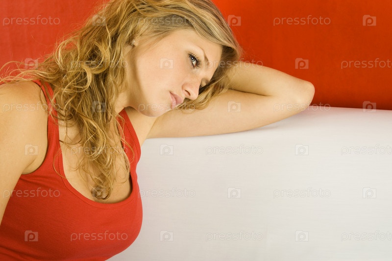 Грустная блондинка сидит на диване