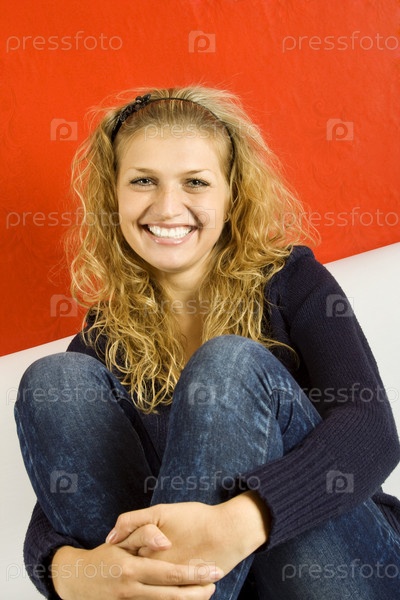 Счастливая блондинка сидит на диване