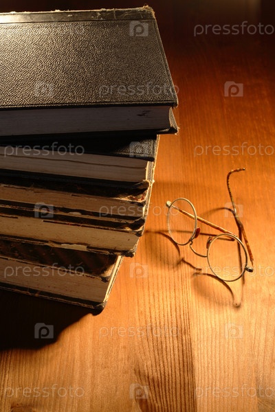 Старые очки и книги на деревянном столе