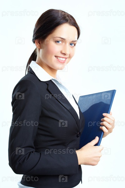 Портрет девушки в деловом костюме с синий папкой в руках