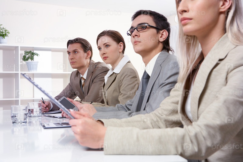 Семинар. Четыре человека в деловых костюмах внимательно слушают