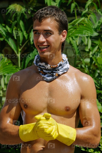 Красивый молодой человек в желтых резиновых перчатках