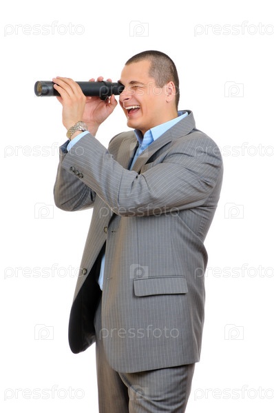 Молодой человек в деловом костюме с подзорной трубой