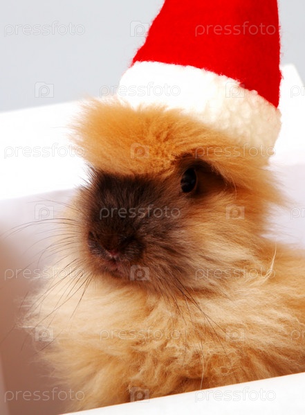 Декоративный бежевый кролик в новогоднем колпаке в коробке