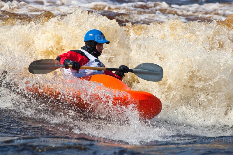 Мужчина сплавляется на байдарке. Соревнования