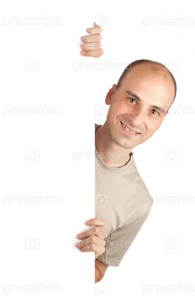 Улыбающийся мужчина выглядывает из-за белой стенки