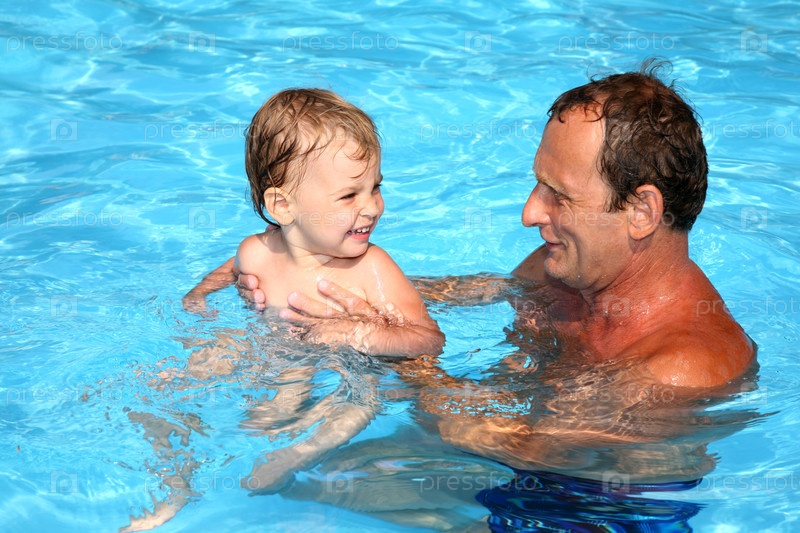 Дед играет с внуком в бассейне