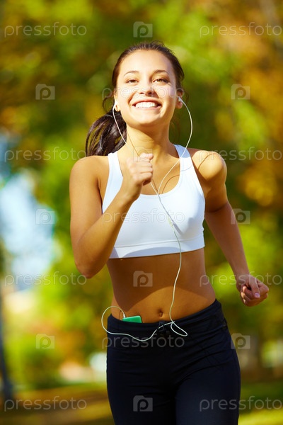 Девушка с плеером на пробежке. Крупный план