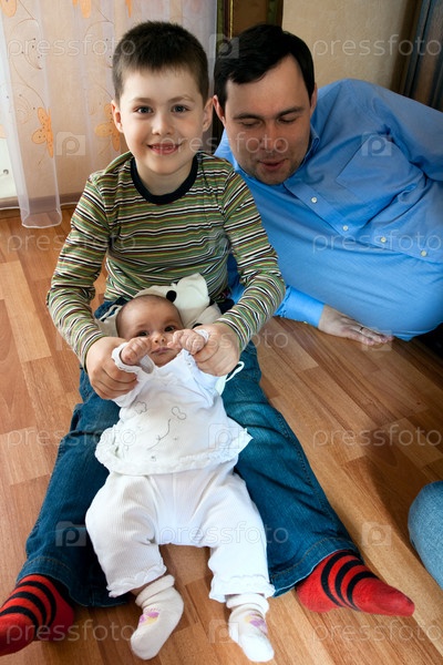 Отец с сыном и маленькой дочерью играют на полу