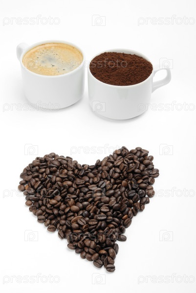 Сердце из кофейных зерен на фоне белых чашек с кофе