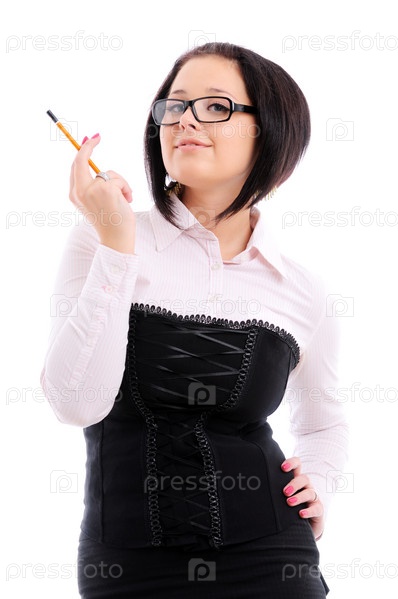 Улыбающаяся девушка в рубашке и очках держит карандаш