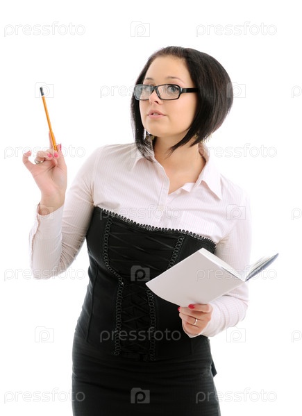 Девушка в рубашке и очках держит карандаш с книгой