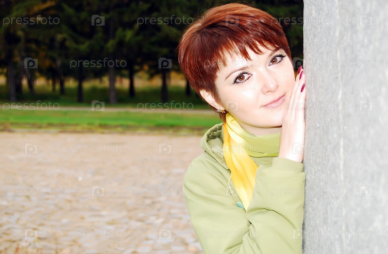 Молодая девушка прислонилась к колонне