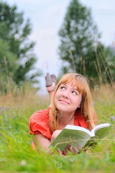 Молодая улыбающаяся девушка лежит на зеленой траве с книгой