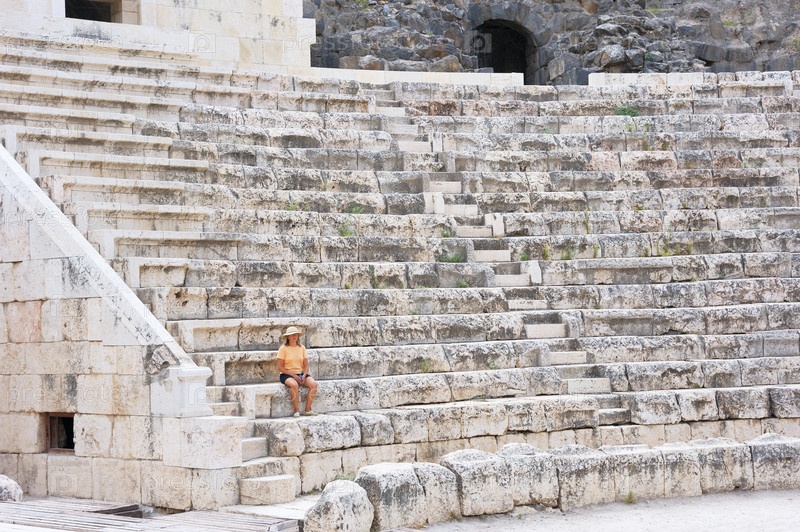 Женщина сидит на ступеньках древнего римского амфитеатра в городе Бейт-Шеан, Израиль
