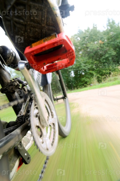 Вид с велосипедной рамы на дорогу в движении