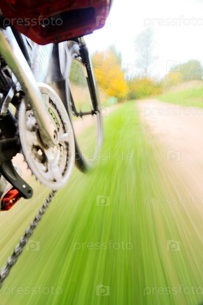 Вид с велосипедной рамы на дорогу в движении