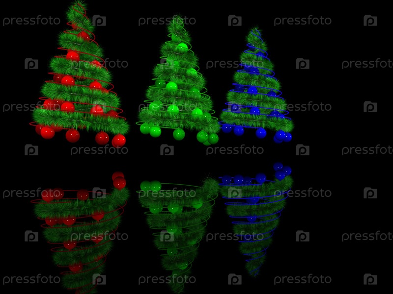 Рождественские елки с украшениями на черном фоне. 3D