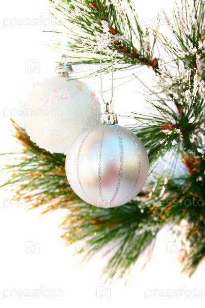 Белые блестящие шары для Новогодней елки, крупным планом