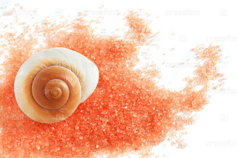 Природная розовая соль и раковина на белом фоне