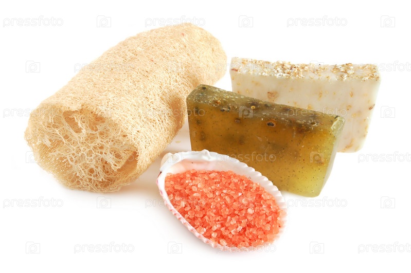 Куски мыла, люфа и соль на белом фоне