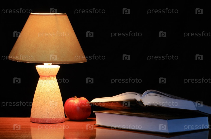 Лампа, яблоко и две книги на темном фоне