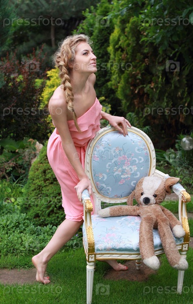 Привлекательная блондинка в розовом платье с игрушкой в саду