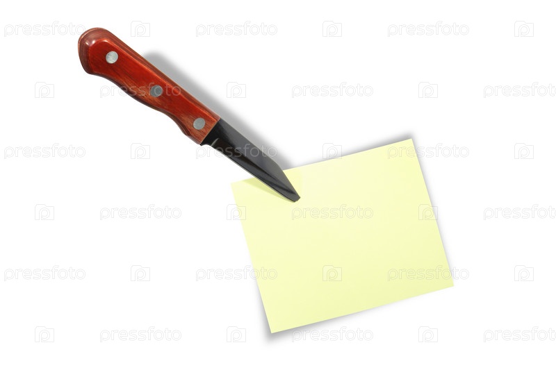Кухонный нож воткнут в стикер на белом фоне