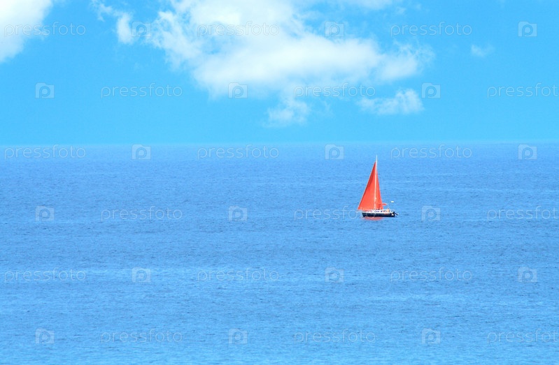 Лодка с красными парусами на фоне синего моря и неба