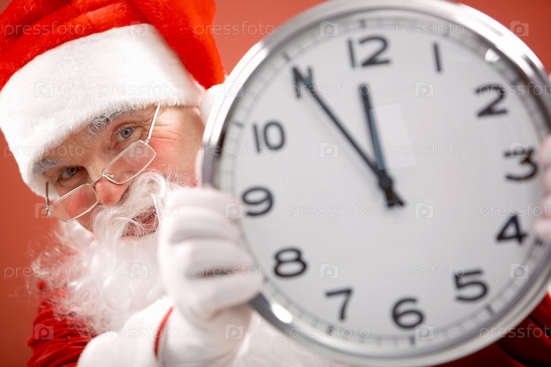 Санта Клаус с большими часами. Крупный план